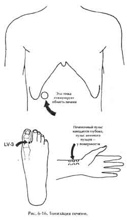 1) Выполняя массаж этой области, можно освободить ученика от злости. Одной рукой массируйте область печени, отмеченную на схеме Ци Нэйцзан, а другую держите на точке меридиана печени LV-3 (Liver), расположенную возле большого пальца ноги (рис. 6-16).