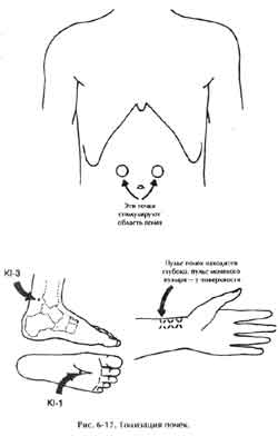 1) Одной рукой массируйте область почек в соответствии со схемой Ци Нэйцзан, держа вторую руку на точке К-3 на лодыжке. При этом ученик может избавиться от страха. Массаж следует производить с обеих сторон.