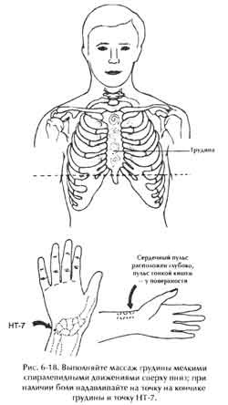 Если человек проявляет нетерпение, беспокойство, вспыльчивость и/или испытывает чувство ненависти, область сердца будет застойной, уплотненной, болезненной и блокированной. Дыхание может быть затруднено. Для снятия напряжения и скованности и повышения самооценки и уверенности помассируйте область грудины рядом с сердцем (рис. 6-18).