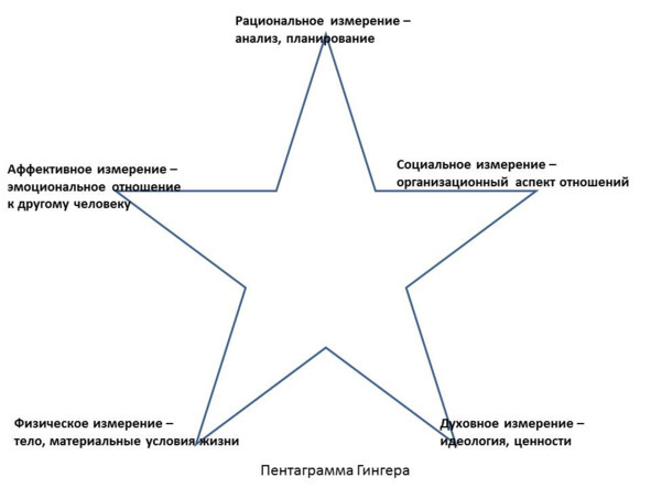 Известный французский гештальт-терапевт Серж Гингер писал, что человеческая жизнь протекает одновременно в пяти измерениях – физическом, социальном, эмоциональном, рациональном и духовном. Он изображал это в виде пентаграммы.